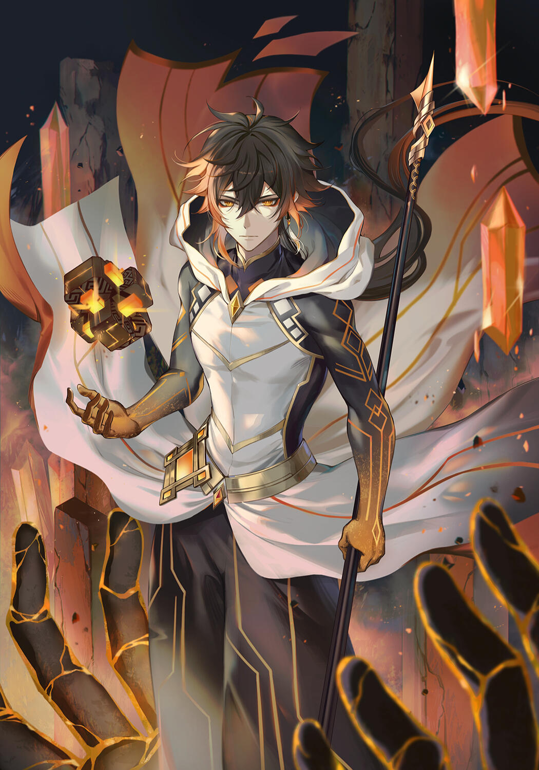 Joyeuse: Valen's most commonly seen blade and finest creation. Its color changes thirty times a day and is often referred to by him as a "kaleidoscopic marvel very reminiscent of the Bifrost". While wielding this longsword, Valen's Mana Burst gains the 'Light' attribute and becomes particularly potent against things of evil nature. Valen struggled to forge this weapon over the years, creating at least 11 failed versions before finally completing this one for a total of 12. He was so happy at its success that he aptly named it "Joyeuse".Mjöllnir: The Thunderer's hammer of legend. Its power commands the skies, rips lightning from the heavens, and weighs the weight of the stars. Very few can pick it up, though anyone technically can. Unlike Milna, Valen's newer hammer, Mjöllnir has no worthiness enchantment on it. Despite this, he has every confidence in the strength of this tool and rarely calls upon its wrath.Ascalon: A godblade forged by an alien blacksmith using an elder storm dragon's eye and the mechanical arm of an ancient hero blessed by silent gods. The creation of this blade signifies Valen’s final connection to humanity being severed and as such has the ability to cut ties quite efficiently. Valen's initial intention was for it to rival Excalibur, but its full strength is a mystery even to him. It is rarely seen and rarely used.